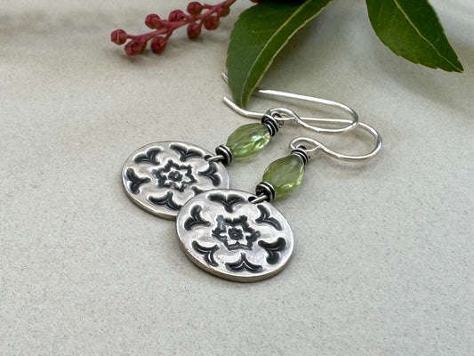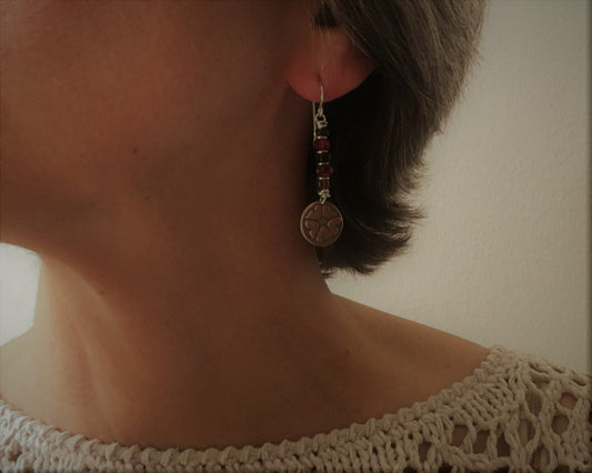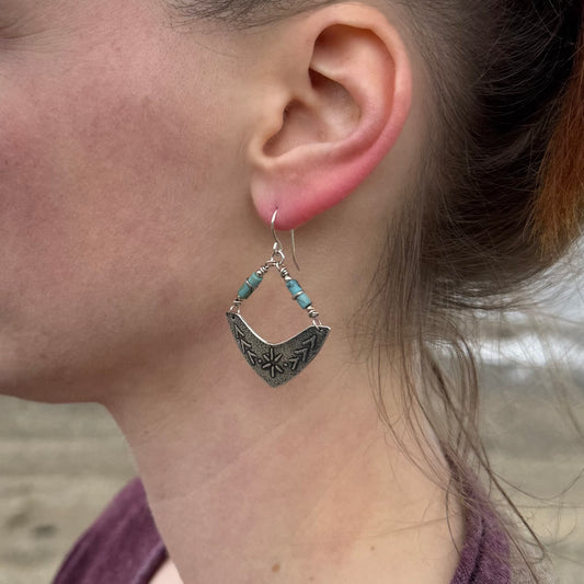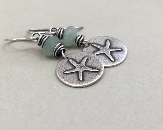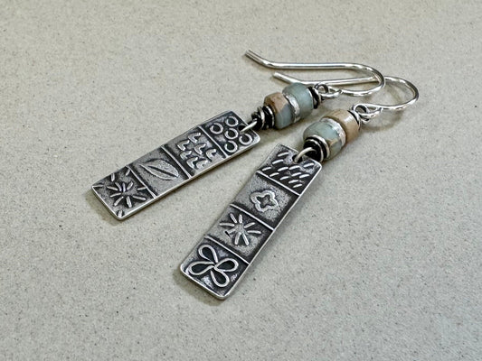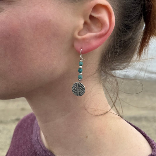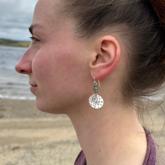 Silver starburst sashiko stitch earrings with seafoam green Java glass