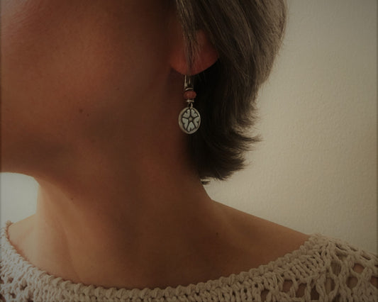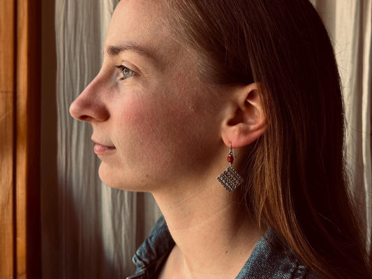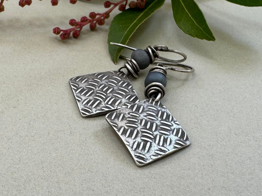 Sashiko cross stitch earrings in oxidized sterling silver with gray Java glass bead