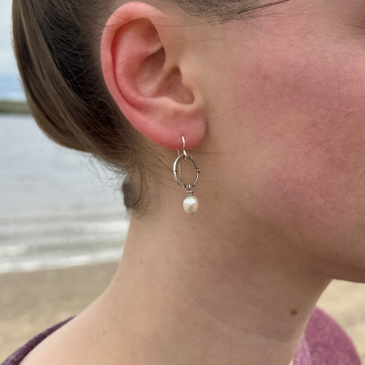 Small textured silver hoops with freshwater pearls