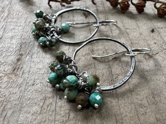 Rustic silver hoops with African turquoise bead cluster