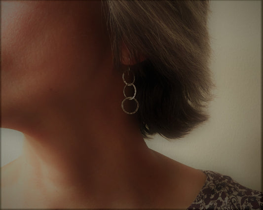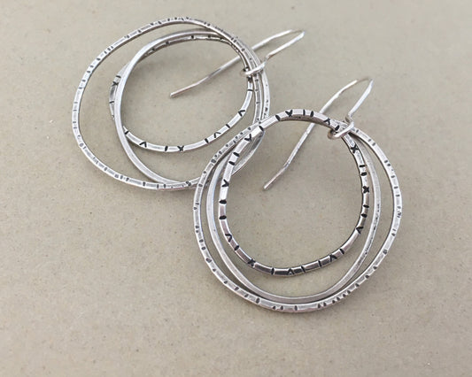 Triple linked textured hoops in oxidized sterling silver