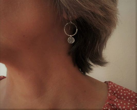 Small hoops with primitive sun dangles in oxidized sterling silver