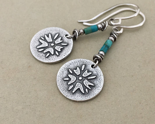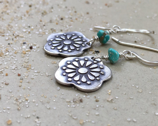 Boho southwestern flower earrings in oxidized sterling silver with turquoise beads
