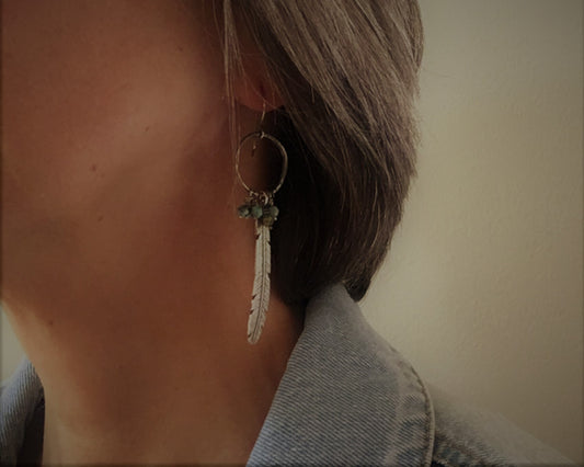 Bohemian silver feather earrings with African turquoise