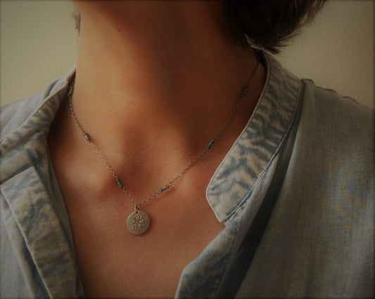 Silver flower charm on turquoise beaded chain