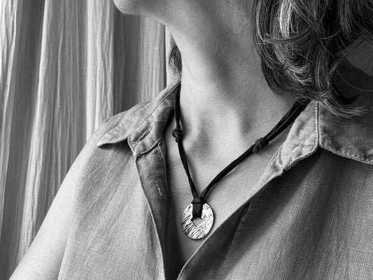 Rustic silver wood grain pendant on adjustable leather lace