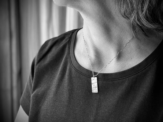 Minimalist silver wood grain dog tag necklace