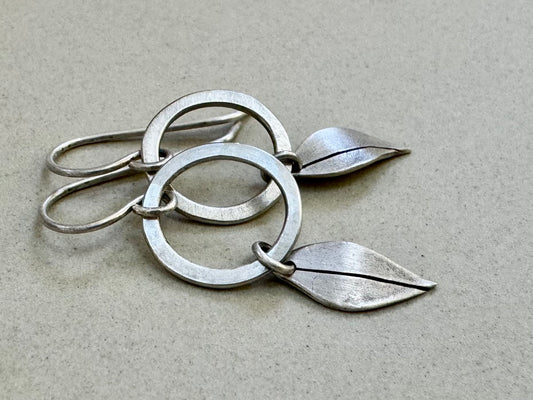 Little silver hoops with simple leaves in a brushed satin finish