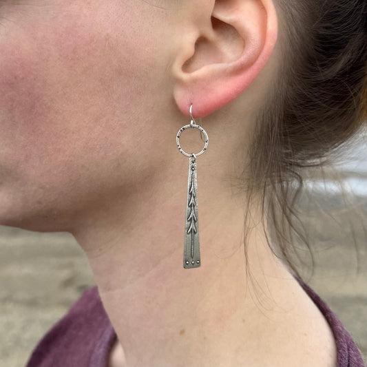 Lone pine tree earrings - long dangle with hoop in oxidized silver