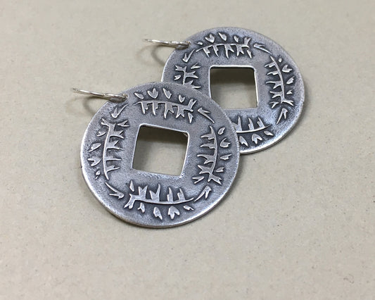 Pine branch coin earrings in oxidized sterling silver