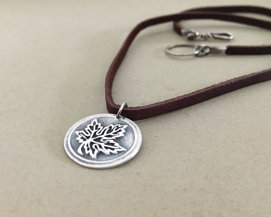 Silver maple leaf pendant on leather
