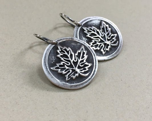 Maple leaf earrings in oxidized sterling silver - cast from vintage button